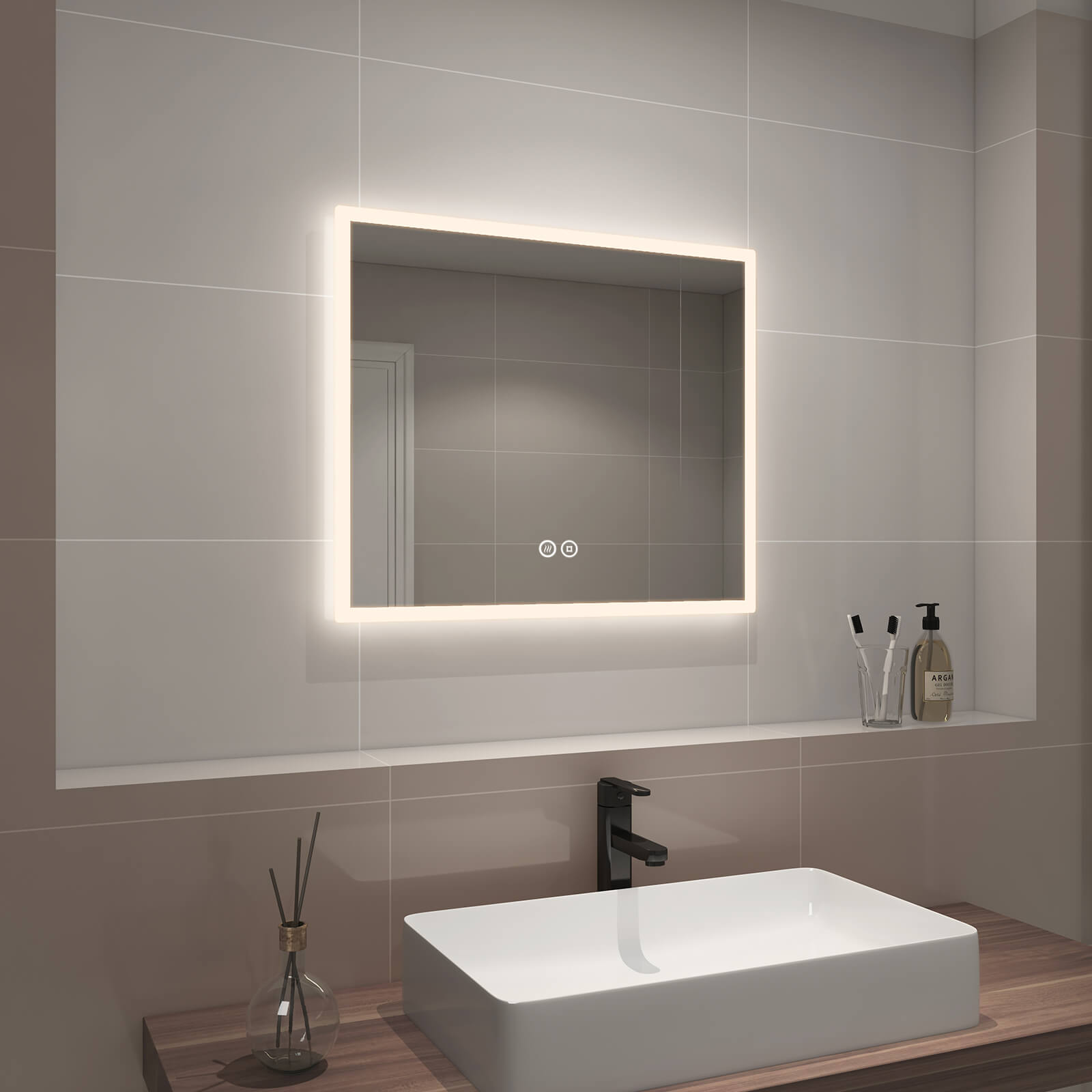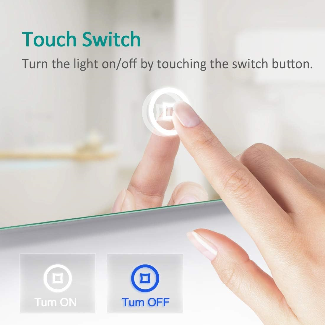 • Simple Operation: The anti-fog function is controlled by an independent touch key. The warm white light is turned on with another touch switch. Both touch switches are located in the lower center of the mirror. The switches are clearly visible and easy to use.
